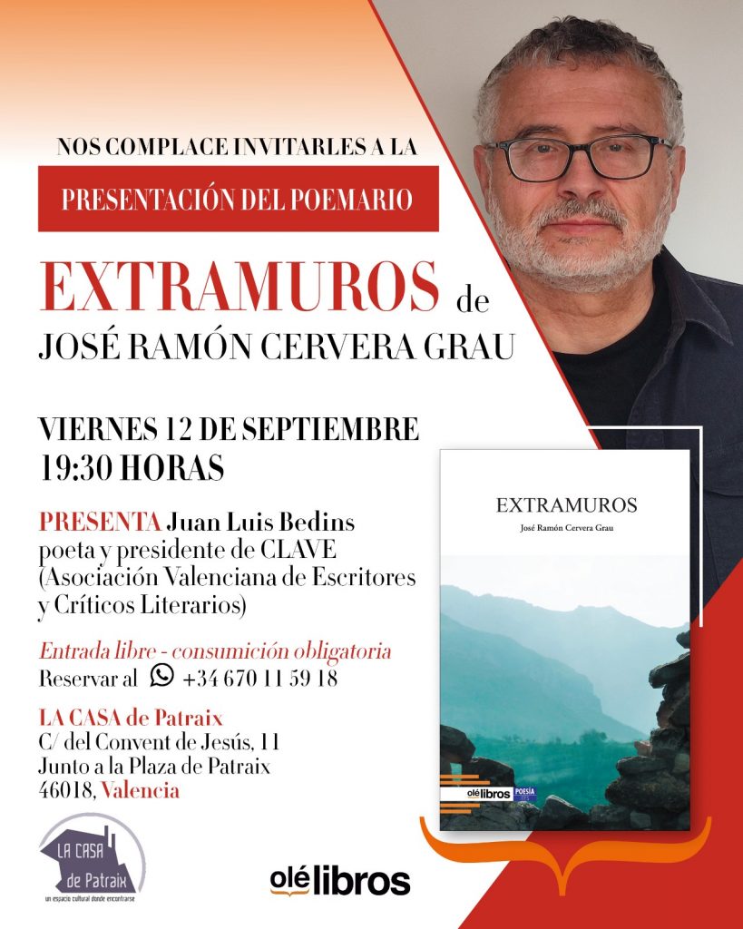 El pasado viernes, 12 de septiembre, a las 19:30 horas, tuvo lugar la presentación del poemario titulado EXTRAMUROS (Olé Libros, 2025), de José Ramón Cervera Grau. Juan Luis Bedins (escritor, poeta y presidente de CLAVE) presentó el acto.Se celebró en LA CASA de Patraix, C/ del Convent de Jesús, 11 – Valencia (junto a la »more