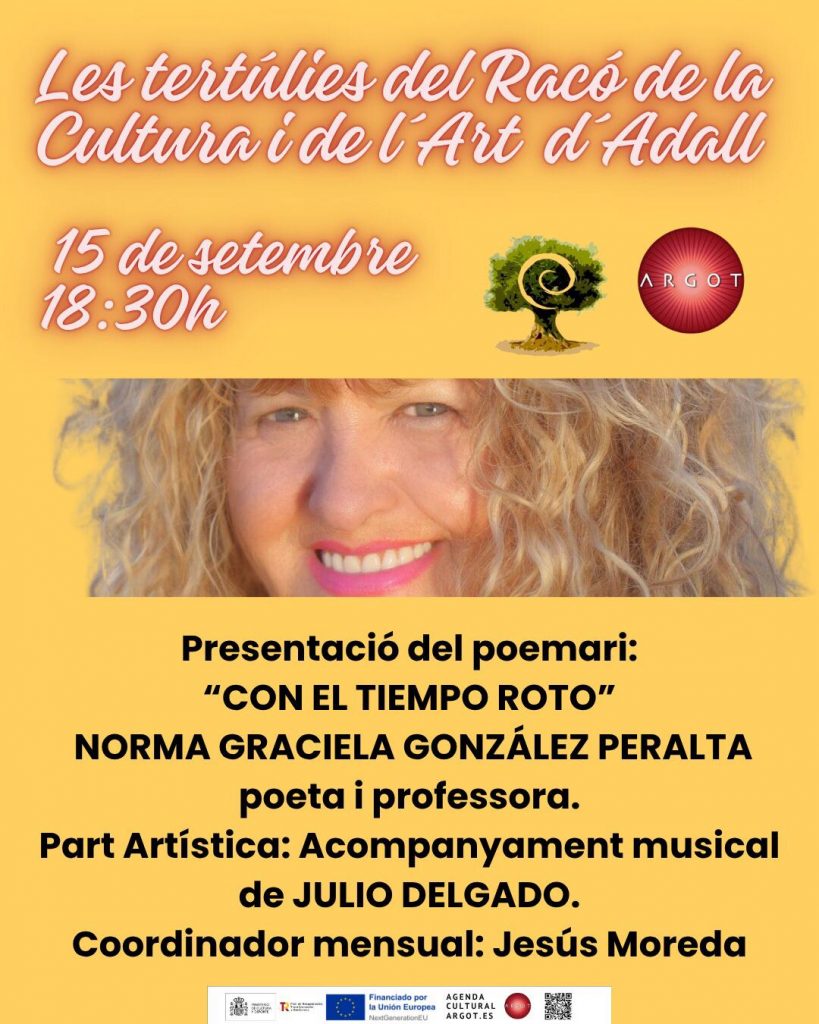 El pasado lunes, día 15 de septiembre, a las 18:30 horas, se presentó el poemario titulado CON EL TIEMPO ROTO, de Norma Graciela González Peralta.La autora estuvo acompañada en la parte artística por el músico Julio Delgado.Coordinó el acto: Jesús Moreda.El evento tuvo lugar en la Librería ARGOT, C/ de Sant Vicent, 16, bajo – »more