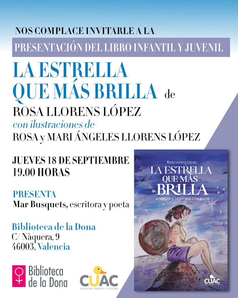 El pasado jueves, 18 de septiembre, a las 19:00 horas, se presentó el libro infantil y juvenil LA ESTRELLA QUE MÁS BRILLA (CUAC, 2025), de Rosa Llorens López. El libro cuenta con ilustraciones de Rosa y Mari Ángeles Llorens López. La autora estuvo acompañada por Mar Busquets-Mataix. El evento tuvo lugar en la Biblioteca de »more