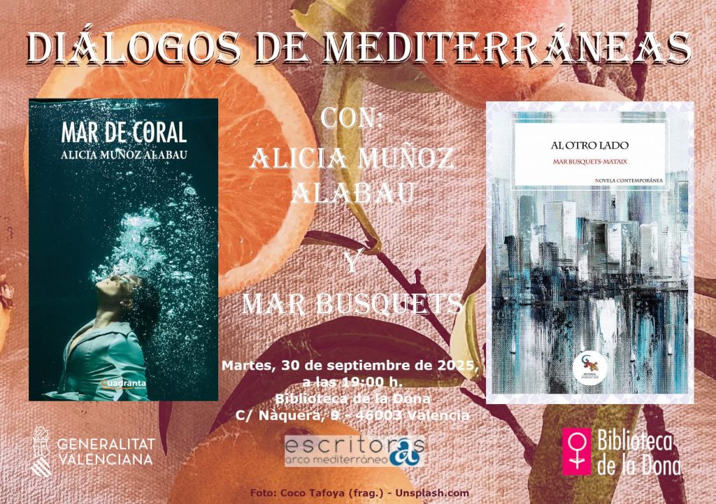 El próximo martes, 30 de septiembre, a las 19:00 horas, tendrá lugar la presentación de dos libros: DIÁLOGOS DE MEDITERRÁNEAS, con Alicia Muñoz Alabau, y su novela MAR DE CORAL, y Mar Busquets-Mataix, y su novela AL OTRO LADO. El acto tendrá lugar en la Biblioteca de la Dona (València).
