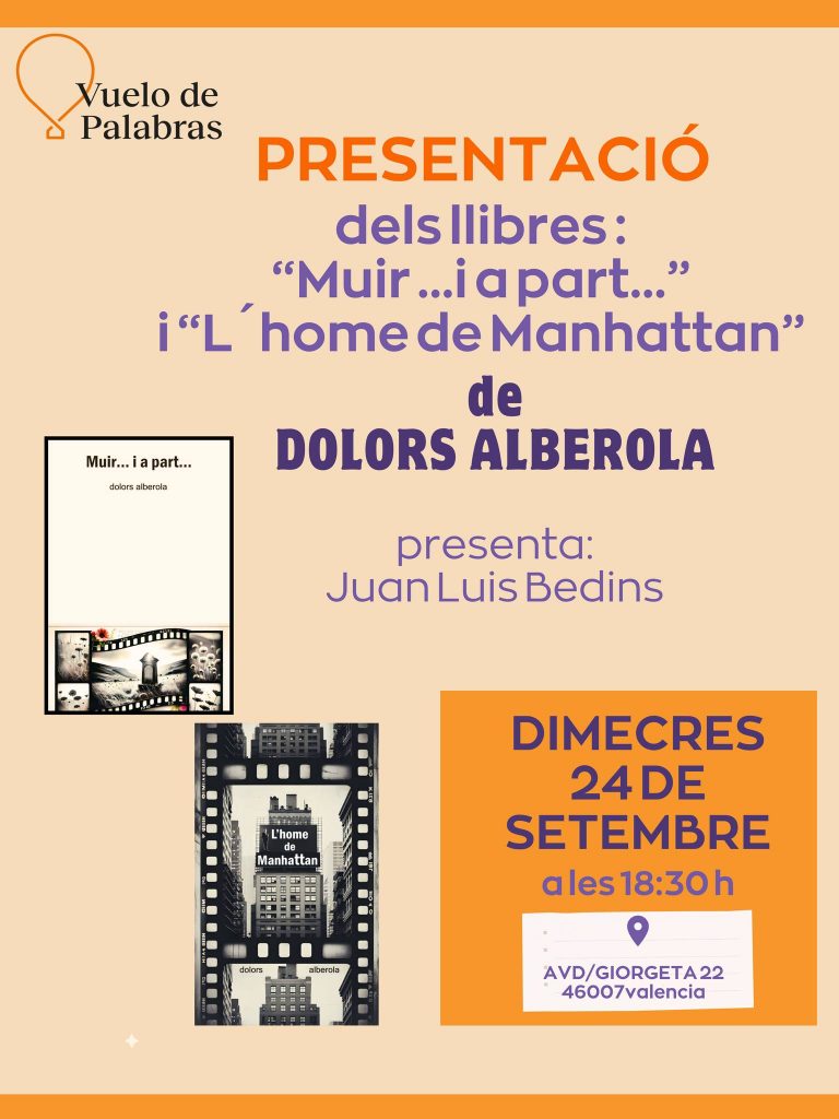 El passat dimecres, 24 de setembre, a les 18:30 hores, es van presentar els poemaris MUIR… I A PART… i L’HOME DE MANHATTAN (ambdós publicats por DF Editors, 2024), de Dolors Alberola.Lèscriptor Juan Luis Bedins (president de CLAVE) va acompanyar l’autora en aquesta presentació.Es va oferir una lectura de poemes a càrrec de Rosa Llorens, »more