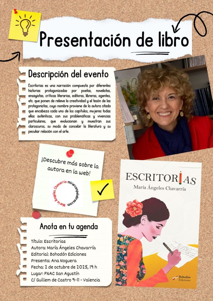 El próximo jueves, 2 de octubre, a las 19:00 horas, en FNAC San Agustín (Valencia): María Ángeles Chavarría presenta su libro de relatos ESCRITORÍAS (Bohodón Ediciones, 2025). La autora estará acompañada por Ana Noguera.