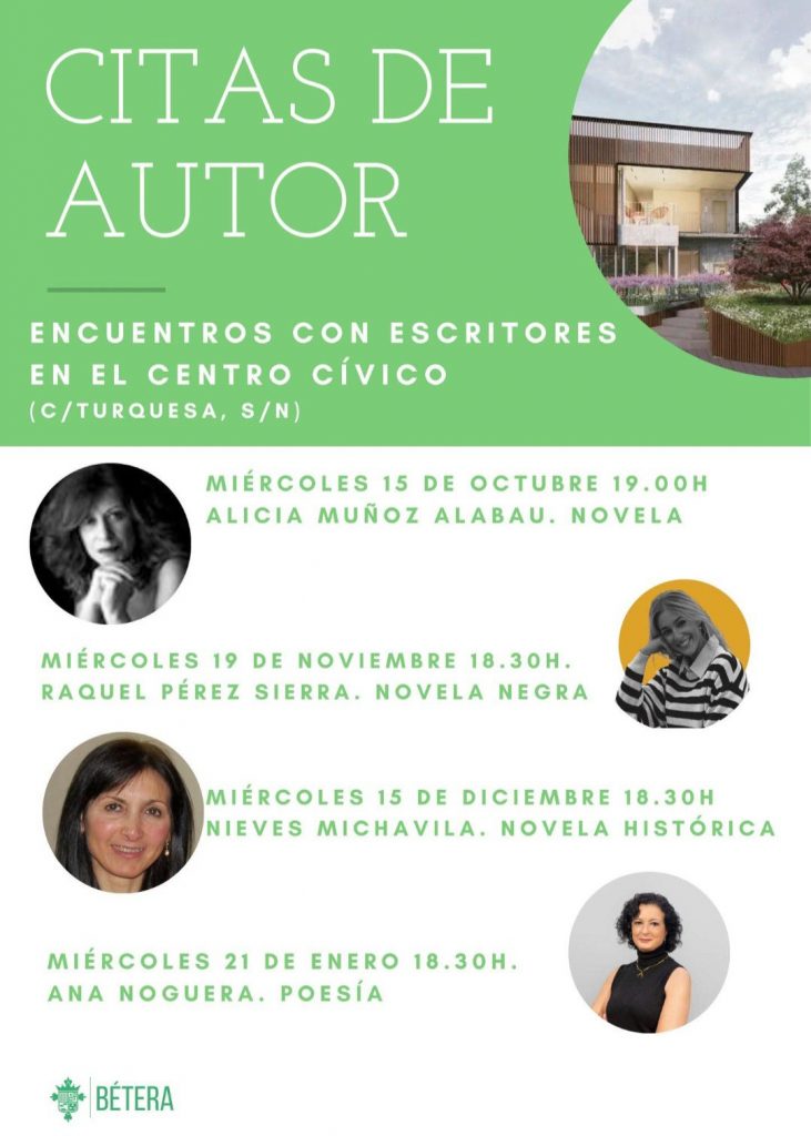 Ya están programadas las fechas del ciclo Citas de autor: encuentro con escritores en el centro cívico de Bétera: 18 de octubre, Alicia Muñoz Alabau 19 de noviembre, Raquel Pérez 18 de diciembre, Nieves Michavila 21 de enero, Ana Noguera