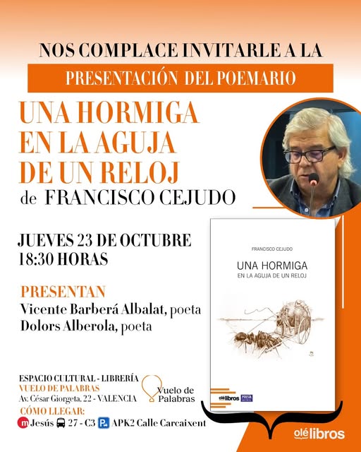 El pasado jueves, 23 de octubre, tuvo lugar en la librería Vuelo de palabras (Valencia) la presentación del libro ‘Una hormiga en la aguja de un reloj’, de Francisco Cejudo. El acto dio comienzo a las 18:30 horas y contó con la participación de los escritores Vicente Barberá y Dolors Alberola.