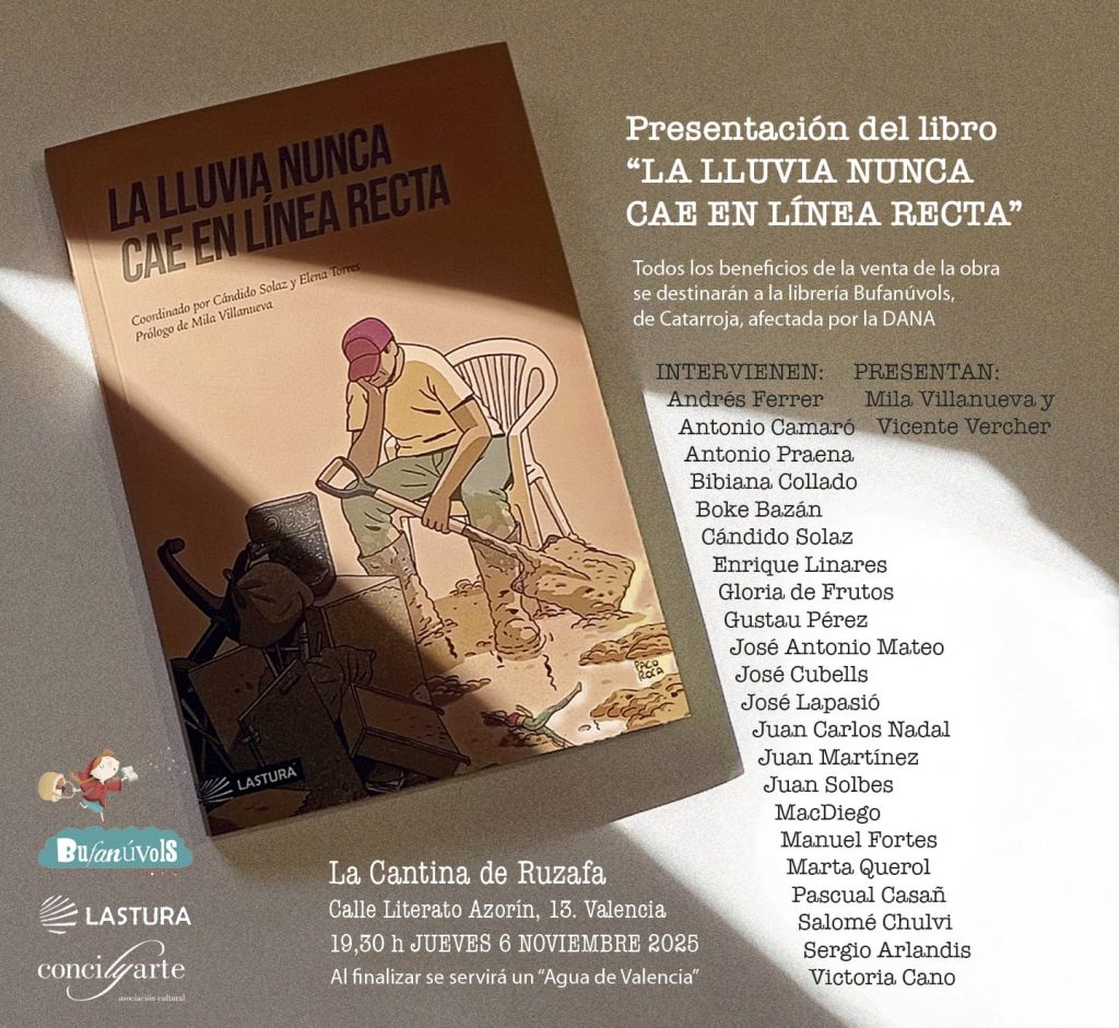 El próximo jueves, 6 de noviembre, a las 19:30 horas, se presentará el libro colectivo titulado LA LLUVIA CAE EN LÍNEA RECTA (Lastura, 2025), que ha estado coordinado por Cándido Solaz, Elena Torres y Mila Villanueva.Todos los beneficios de esta obra irán destinados a la librería Bufanúvols, de Catarroja, una de las afectadas por la »more