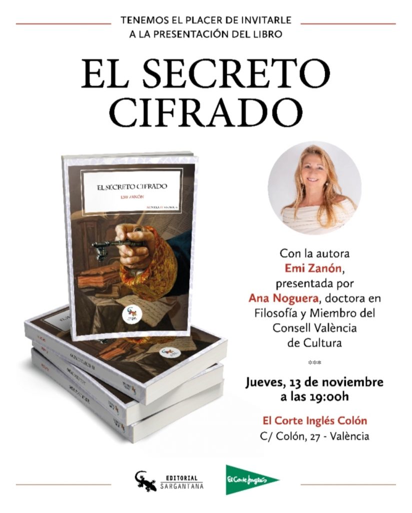 El próximo Jueves, 13 de noviembre, a partir de las 19:30 h, tendrá lugar lapresentación de ‘EL SECRETO CIFRADO’, la nueva novela de la escritora Emi Zanón. El acto tendrá lugar en el Ámbito Cultural de El Corte Inglés de Colón (Valencia) y contará con la participación de Ana Noguera, escritora y miembro del Consel »more