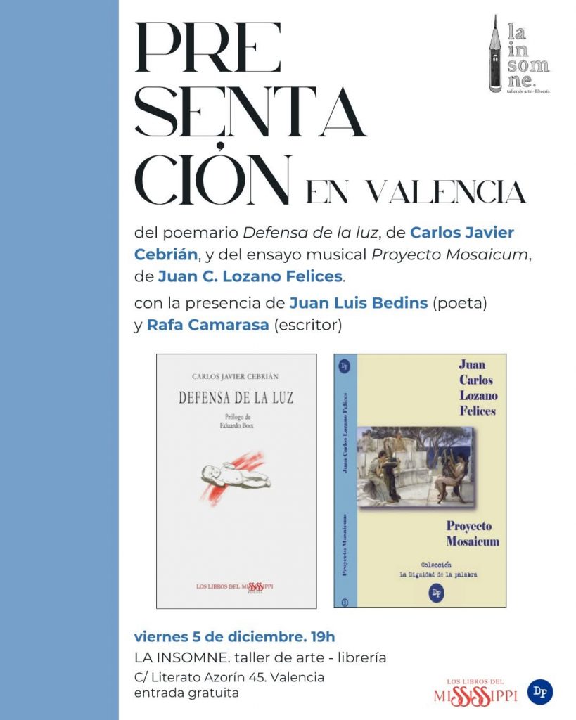 El pasado viernes, 5 de diciembre, a las 19:00 horas, tuvo lugar una doble presentación de libros. Se presentó el libro de poemas DEFENSA DE LA LUZ (Los Libros del Mississippi, 2024), de Carlos Javier Cebrián. Y el ensayo titulado PROYECTO MOSAICUM (La Dignidad de la palabra, 2025), de Juan Carlos Lozano Felices. Intervinieron junto »more
