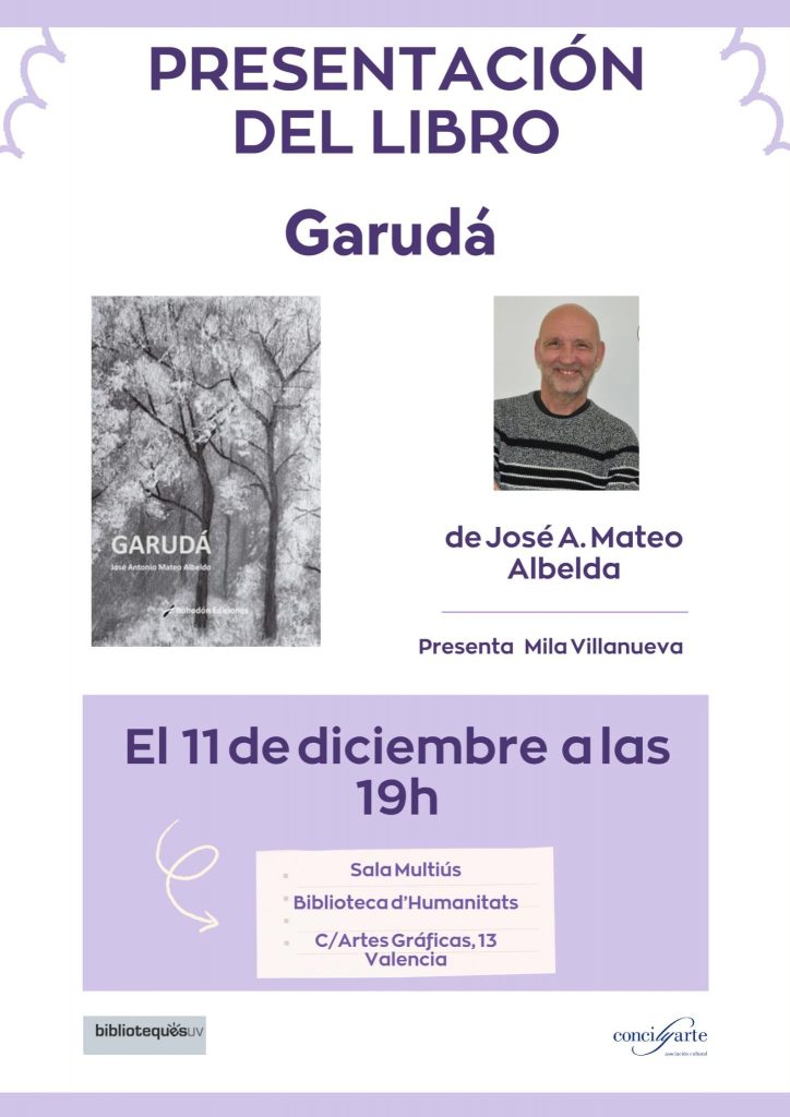 El pasado 11 de diciembre tuvo lugar la presentación del poemario ‘Garudá’, de José Antonio Mateo Albeldo, en la Biblioteca de Humanidades Joan Regla (UV). El acto dio comienzo a las 19 horas y contó con la presentación de MIla Villanueva.