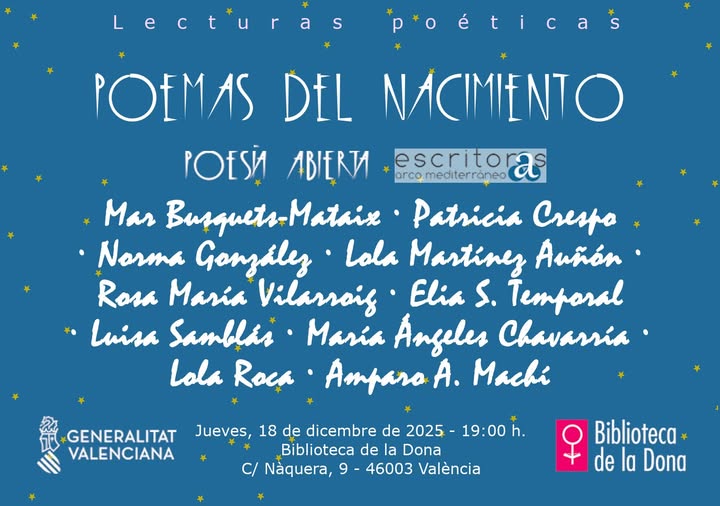 El pasado jueves, día 18 de diciembre, a las 19:00 horas, tuvo lugar el evento titulado Lecturas poéticas POEMAS DEL NACIMIENTO, poesía abierta con la participación de miembros de la Asociación de Escritoras del Arco Mediterráneo. Se celebró en la Biblioteca de la Dona, C/ Nàquera, 9 – València.
