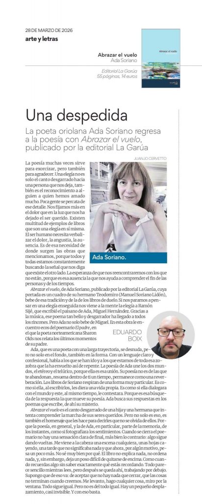 Eduardo Boix reseña para el suplemento ‘Artes y Letras’ el poemario ‘Abrazar el vuelo’, de Ada Soriano.