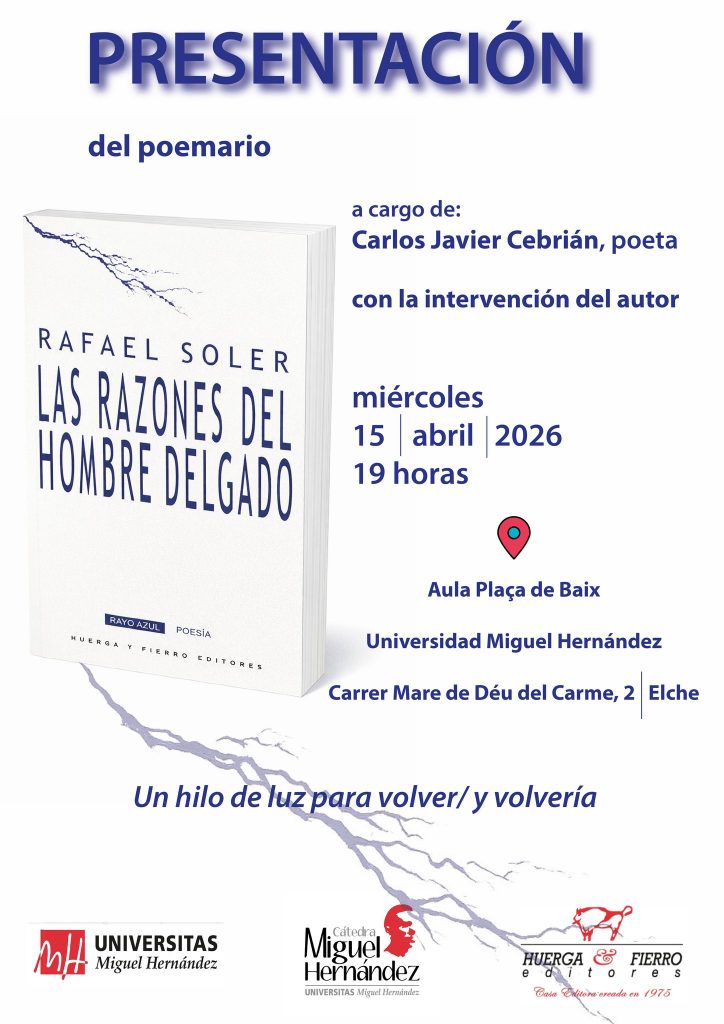El próximo 15 de abril Rafael Soler presentará su poemario ‘Las razones del hombre delgado’. Será en la Universidad Miguel Hernández, de Elche, a partir de las 19 horas, y contará con la participación del poeta Carlos Javier Cebrián.