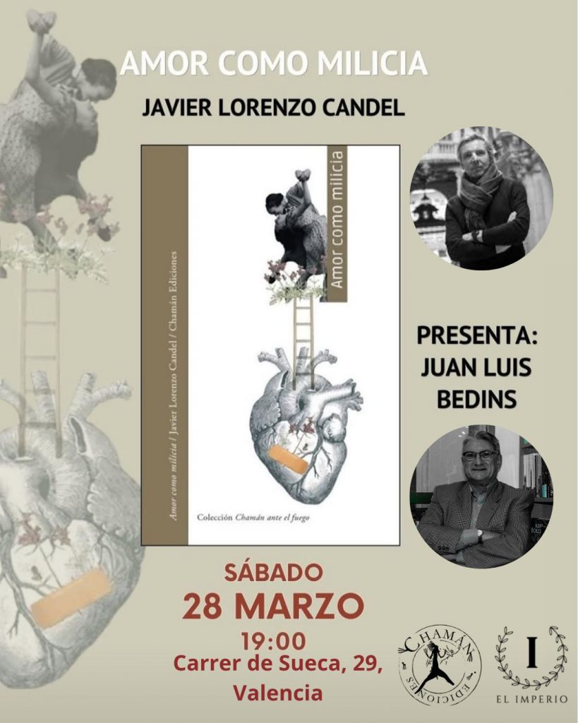 El pasado sábado, 28 de marzo, a las 19:00 horas, el escritor Javier Lorenzo Candel presentó el libro de poemas AMOR COMO MILICIA (Chamán Ediciones, 2025). Juan Luis Bedins, escritor, poeta y presidente de CLAVE, presentó el acto. La presentación tuvo lugar en la Librería El Imperio, C/ Sueca, 29 – Valencia (Russafa).