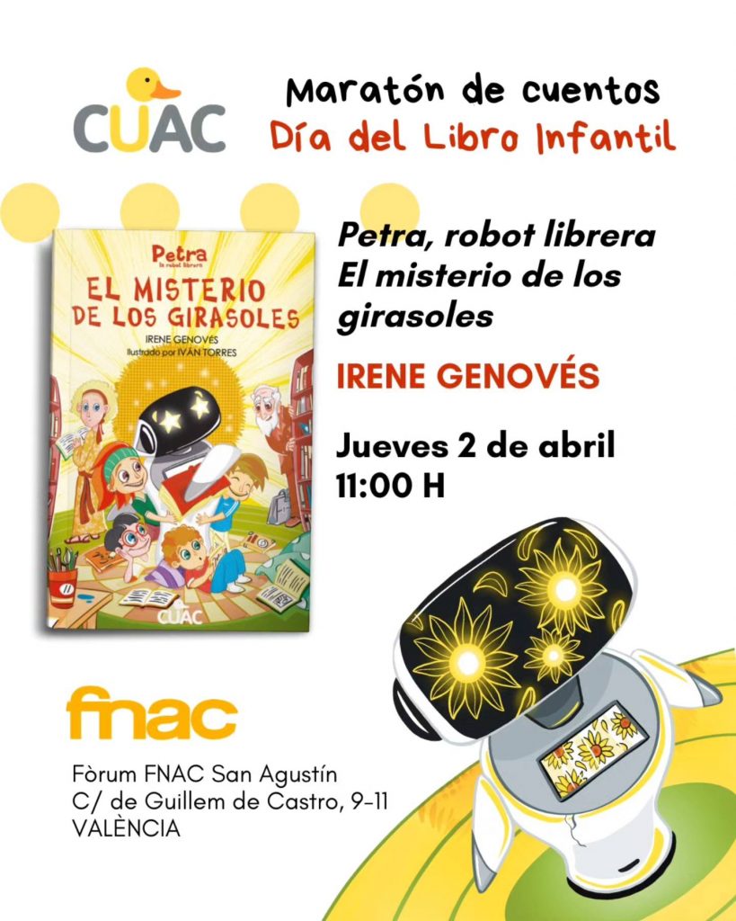 El pasado jueves, 2 de abril, a las 11:00 horas, hubo un MARATÓN DE CUENTOS con motivo del Día del Libro Infantil.Irene Genovés participó con su libro ‘PETRA, ROBOT LIBRERA. EL MISTERIO DE LOS GIRASOLES’ (Cuac, 2025).Tuvo lugar en el Fórum FNAC San Agustín, C/ Guillem de Castro, 9-11 – Valencia.