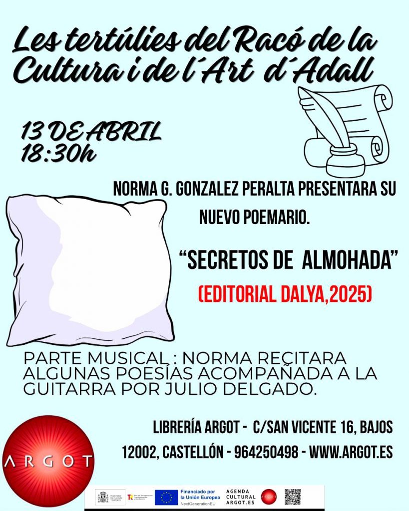 El pasado lunes 13 de abril, a las 18:30 horas, se presentó en la Librería Argot, Calle San Vicente, 16, Castellón, el poemario ‘Secretos de almohada’, de Norma González.Presentó el acto: Victor Vazquez Bayarri.