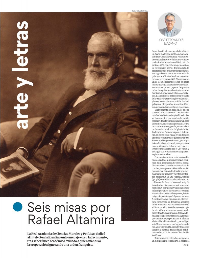 En el diario ‘Información’ del 18 de abril apareció este reportaje abriendo la sección “Arte y Letras”. Son tres páginas en las que José Ferrándiz escribe sobre Rafael Altamira.