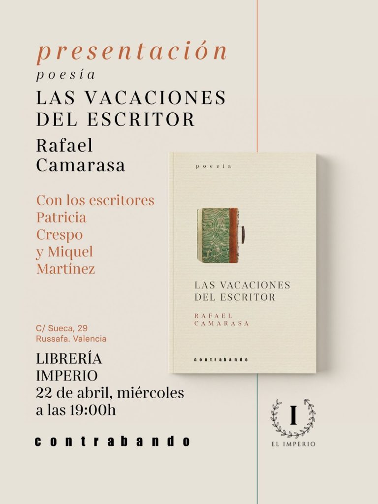 El pasado miércoles, 22 de abril, a las 19:00 horas, se presentó el libro de poemas LAS VACACIONES DEL ESCRITOR (Contrabando, 2026), de Rafael Camarasa.Acompañaron al autor en este acto: Patricia Crespo y Miquel Martínez.Tuvo lugar en la Librería El Imperio, C/ Sueca, 29 – Valencia.