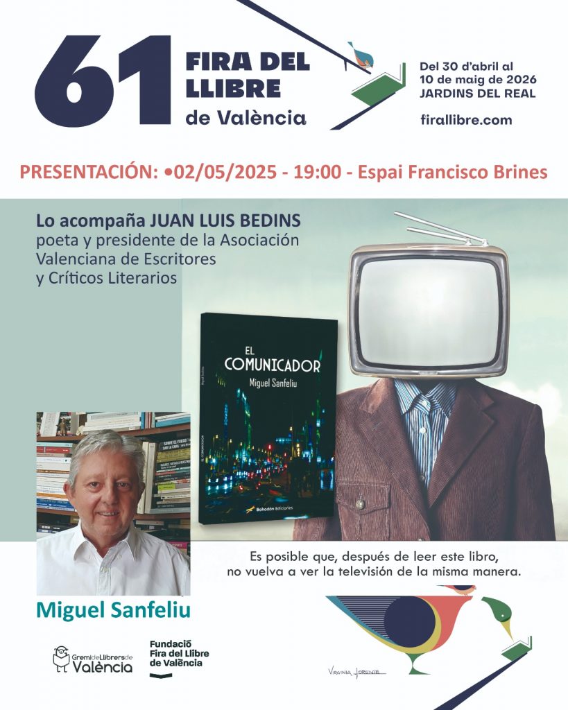 El próximo 2 de mayo, junto al poeta y presidente de CLAVE Juan Luis Bedins, Miguel Sanfeliu presentará su nueva novela “El comunicador” (Bohodón ediciones) en el espai Francisco Brines de la Feria del Libro de Valencia. Será a partir de las 19 horas.