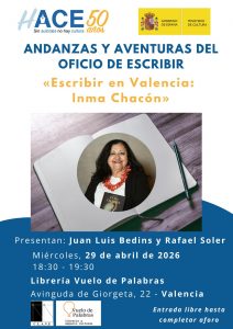 El pasado miércoles, 29 de abril, a las 18:30 horas, se celebró el acto literario ANDANZAS Y AVENTURAS DEL OFICIO DE ESCRIBIR. “Escribir en Valencia: Inma Chacón”.