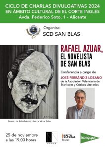 En un acto organizado por la Sociedad Cultural y Deportiva (SCD) San Blas, con la colaboración de la Asociación Valenciana de Escritores y Críticos Literarios (CLAVE) y de Ámbito Cultural de ECI de Alicante, el lunes, 25 de noviembre, a las 19:00 horas, tendrá lugar la conferencia titulada RAFAEL AZUAR, EL NOVELISTA DE SAN BLAS, que correrá a cargo de José Ferrándiz Lozano, miembro de la junta directiva de CLAVE.