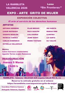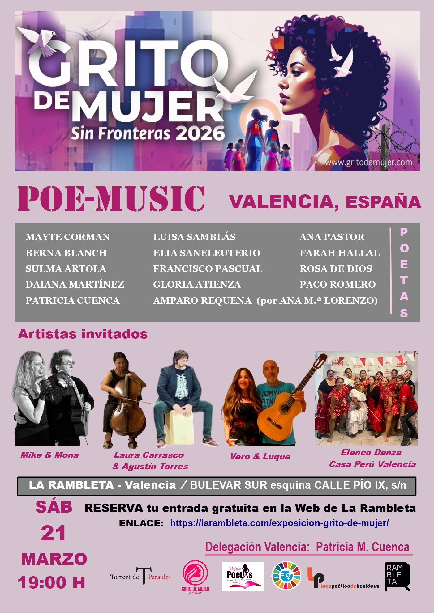 Festival Grito de mujer 2026 Esta fue la programación del festival Grito de mujer 2026: Jueves. 5M – Inauguración de la GMArt Expo + Música en vivo Lun. 9M – Coloquio Mujeres y Vidas ‘sin fronteras’ Sábado 21M – Gala Artística PoeMusic GM (Poesía, Música en Vivo y Danza) « Firma de ejemplares de Irene Genovés Conferencia de Pilar Bellés sobre Las Sinsombrero »