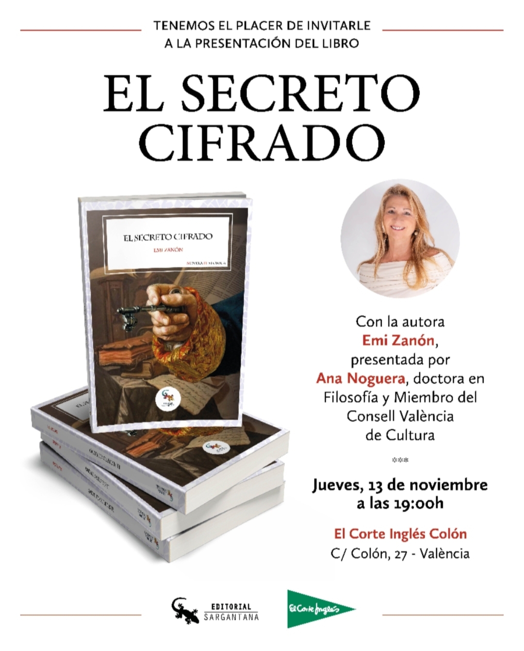 presentación de ‘EL SECRETO CIFRADO’, la nueva novela de la escritora Emi Zanón. El acto tendrá lugar en el Ámbito Cultural de El Corte Inglés de Colón (Valencia) y contará con la participación de Ana Noguera, escritora y miembro del Consel Valencià de Cultura.