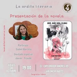 El pasado jueves, 30 de octubre , a las 19:00 horas, en el espacio cultural La ardilla literaria (Valencia), tuvo lugar la presentación de la novela ‘Gris, más bien, plomo’, de Elga Reátegui.