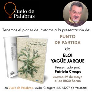 El próximo jueves, 29 de mayo, a las 18:30 horas, se presentará el libro de poemas titulado PUNTO DE PARTIDA (Loto Azul, 2025), de Eloi Yagüe Jarque.