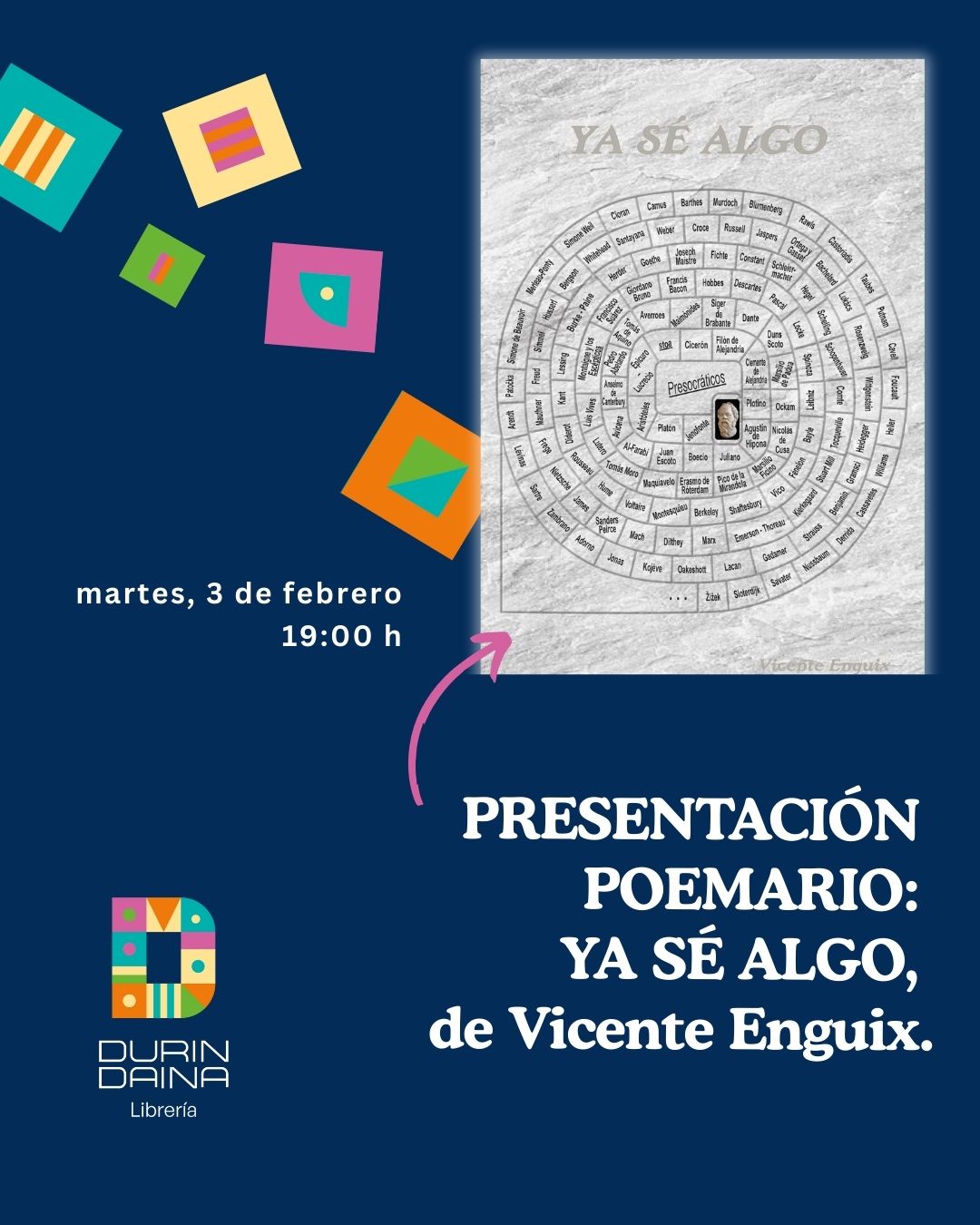 El próximo martes, 3 de febrero, a las 19:00 horas, se presentará el libro de poemas YA SÉ ALGO (Pasionporloslibros, 2025), de Vicente Enguix.