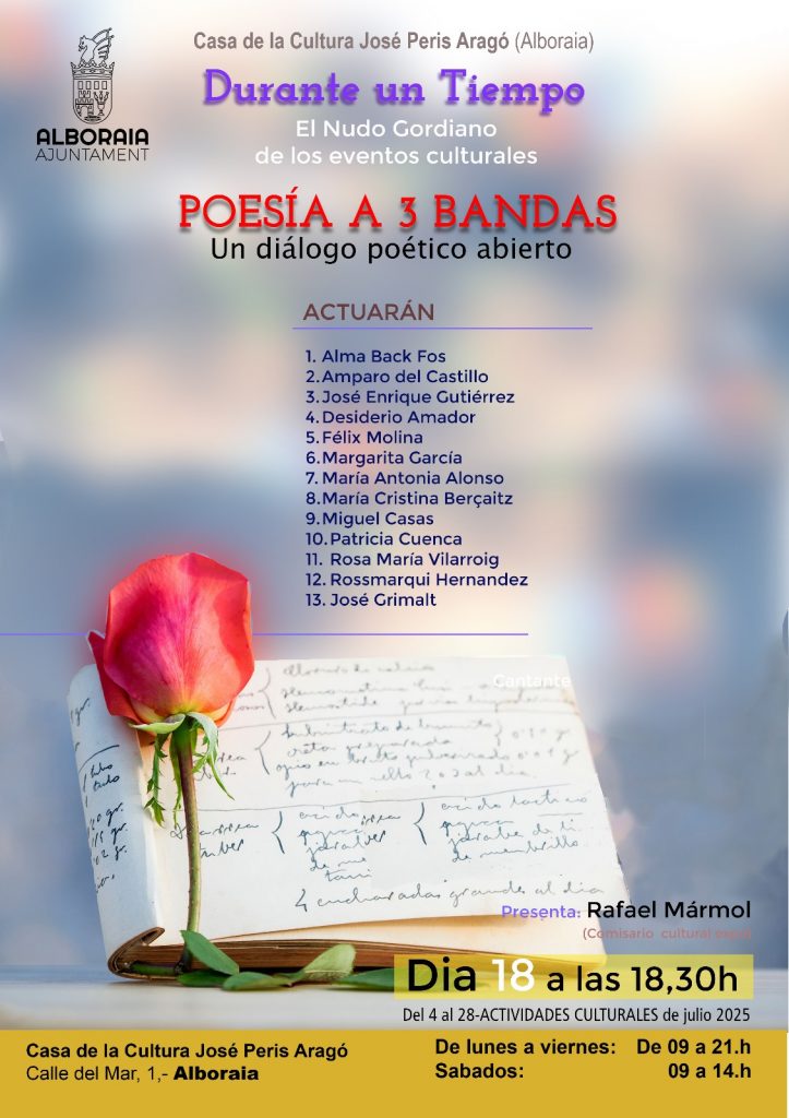 En el marco de la exposición de acuarelas que el pintor, rapsoda y poeta José Grimalt tiene en Alboraia, el pasado viernes, 18 de julio, a las 18:30 horas, se celebró un recital de poesía con la participación de diversos poetas y rapsodas.El acto fue presentado por Rafael Mármol, comisario de la exposición, y tuvo »more