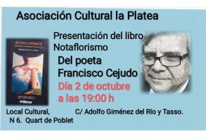 El próximo jueves, 5 de diciembre, a partir de las 18:30 horas, se presentará en la sede del Ateneo Blasco Ibáñez (C/ de la Reina, 68, Valencia) el libro de aforismos Notaflorismos, de Francisco Cejudo. Presentarán el acto Isabel Oliver (presidenta del Ateneo Blasco Ibáñez) y Vicente Barberá (escritor y gestor cultural). El evento contará con la intervención del dúo musical formado por Norma González y Julio Delgado.