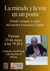 Será en el Espacio Castejón de la Casa de Cultura de Denia. Presenta Francisco Cejudo. Particiopan Poetes per la cultura.