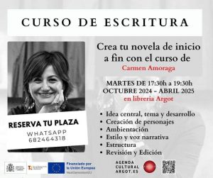 Invitación al curso de escritura (novela) que impartirá Carmen Amoraga los martes, de 17:30 a 19:30 horas, desde octubre de 2024 hasta abril de 2025. Será en la Librería Argot de Castellón.
