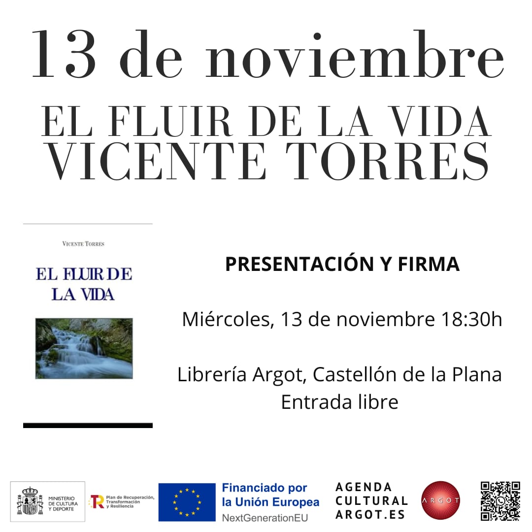 El próximo miércoles, 13 de noviembre, tendrá lugar la presentación del libro El fluir de la vida, de Vicente Torres. El evento dará comienzo a las 18:30 horas en la Librería Agor, de Castellón. La entrada es libre y habrá firma de libros.