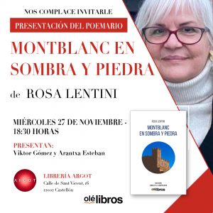 El próximo miércoles, 27 de noviembre, la librería Argot, de Castellón, acogerá la presentación del libro Montblanc en sombra y piedra, de Rosa Lentini. El aco comenzará a partir de las 18:30 horas y acompañarán a la autora los escritores Arantxa Esteban y Víktor Gómez.